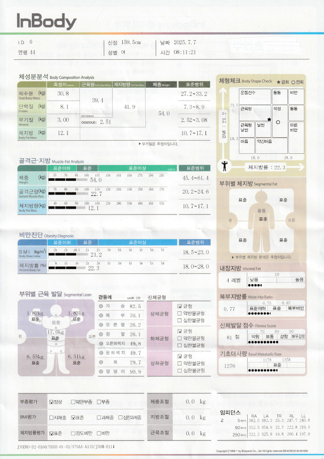 체지방률 23.3%(지방상승 0.1kg, 근육 상승 0.3kg)