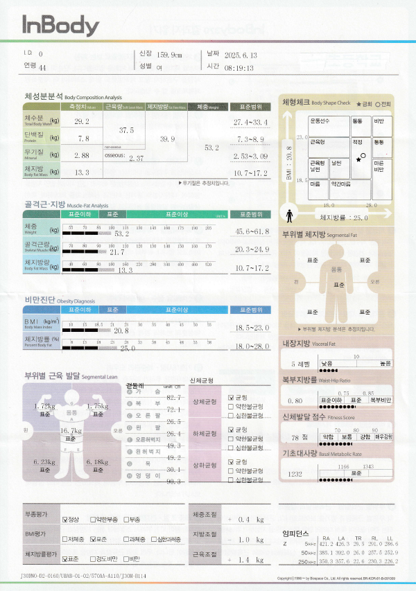 6월 13일에 최저 무게를 찍어서 기념으로 측정한 인바디인데..체지방은 1.2kg줄고 근육은 1.9kg 늘었당..^^